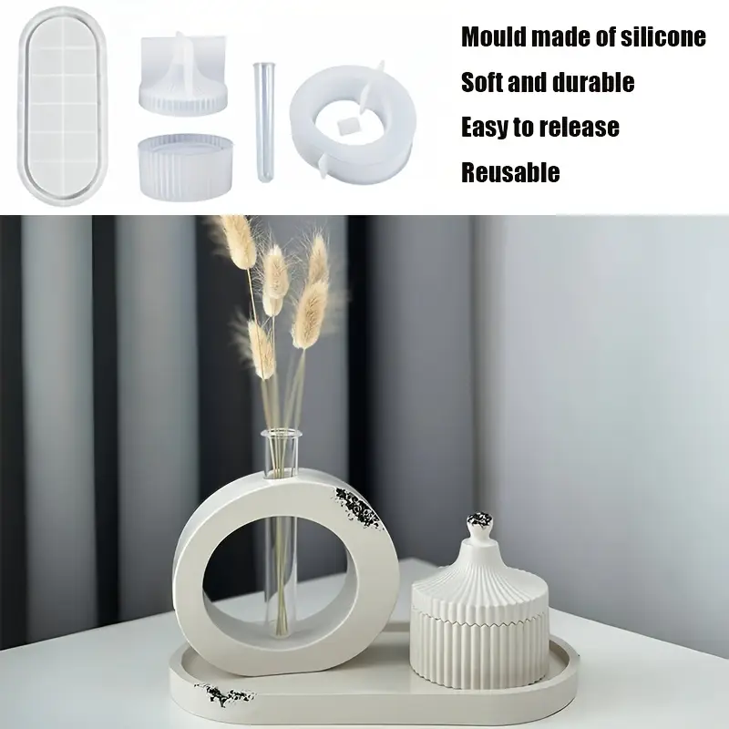 مجموعة قوالب سيليكون مكونة من 4 قطع للديكور المنزلي – ناعمة ومتينة وسهلة التنظيف/الفك، مثالية للخرسانة والجص والحرف اليدوية والهدايا المصنوعة من الراتنج – أشكال مقوسة ودائرية وبيضاوية مع تصميمات لوعاء تخزين مخطط وحامل نباتات