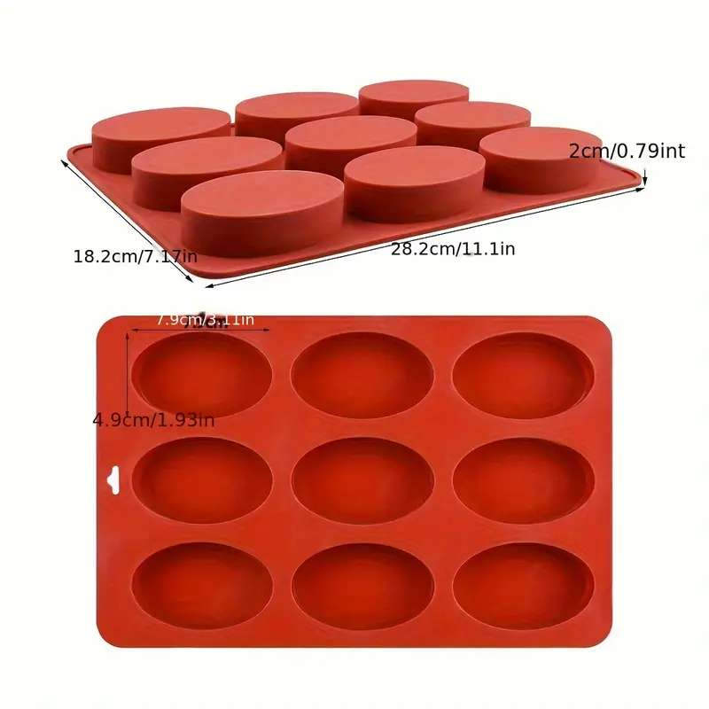 حجم القالب: 28.6 × 18.5 × 2 سم؛ حجم التجويف الواحد: 8.2 × 5.1 × 2 سم؛ وزن الصابون/الشمع/الشوكولاتة التقريبي: 55 غرامًا.