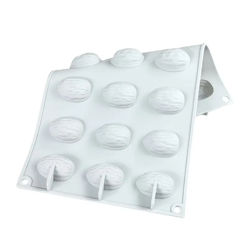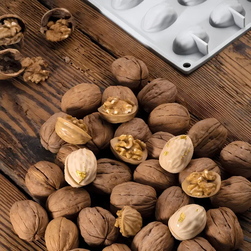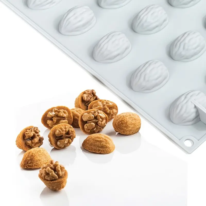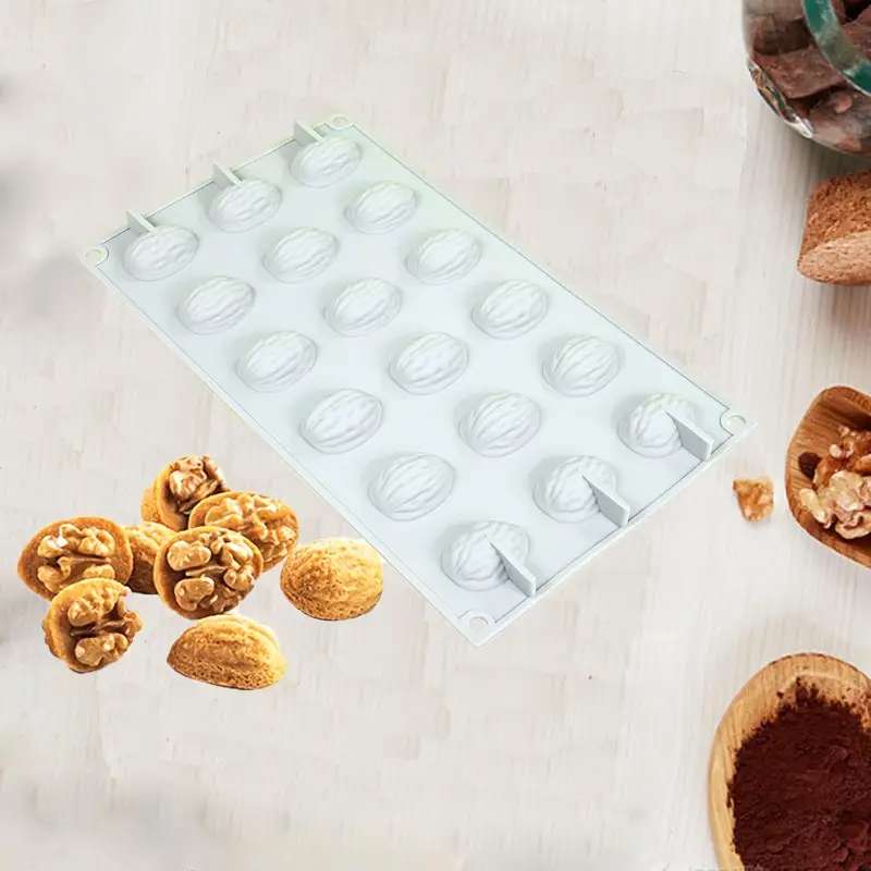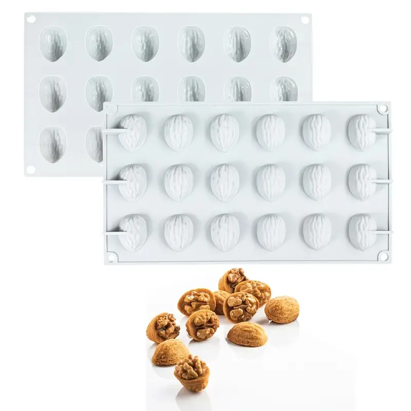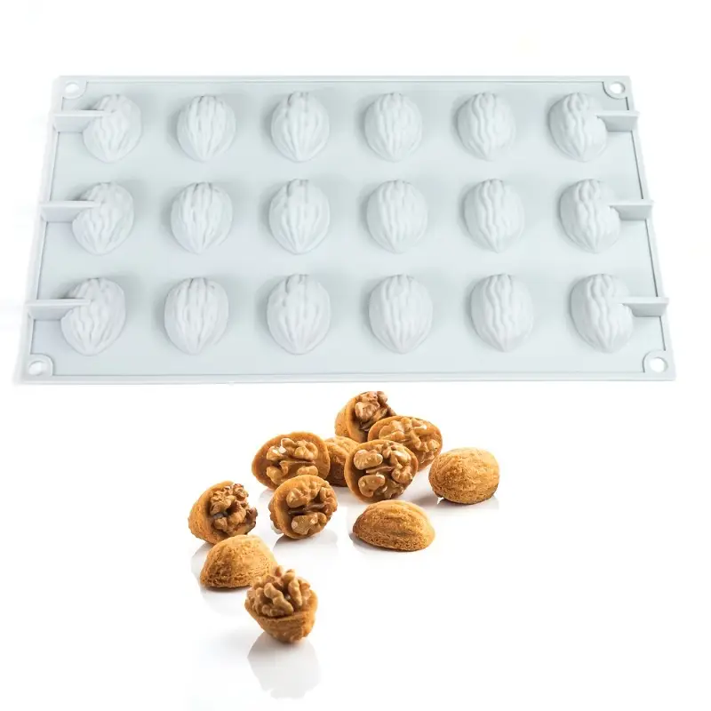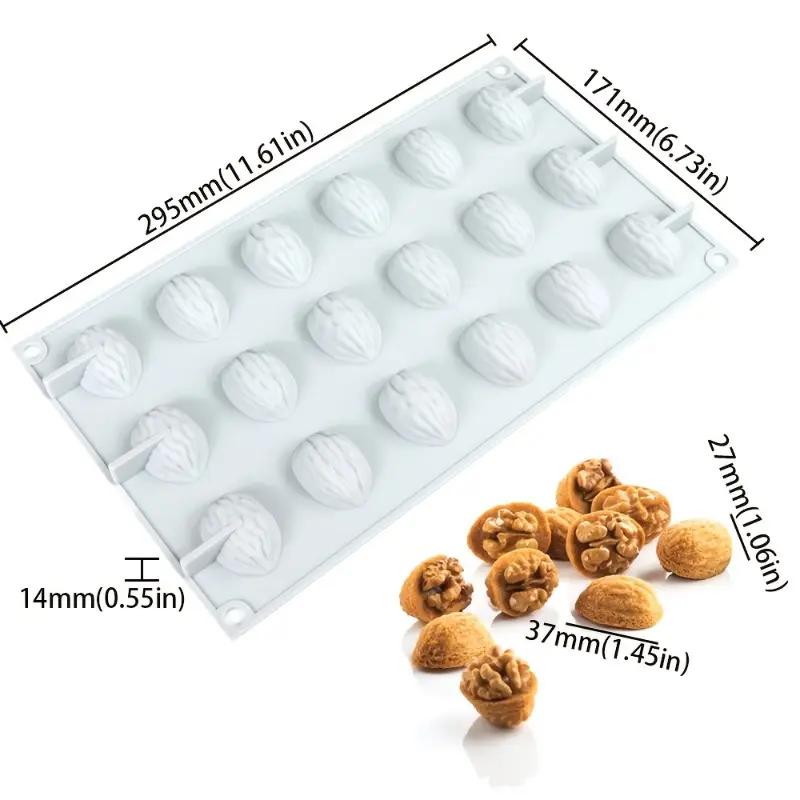 يحتوي القالب على 18 تجويفًا، كل منها مصمم لإنتاج شكل نصف حبة جوز واقعي.