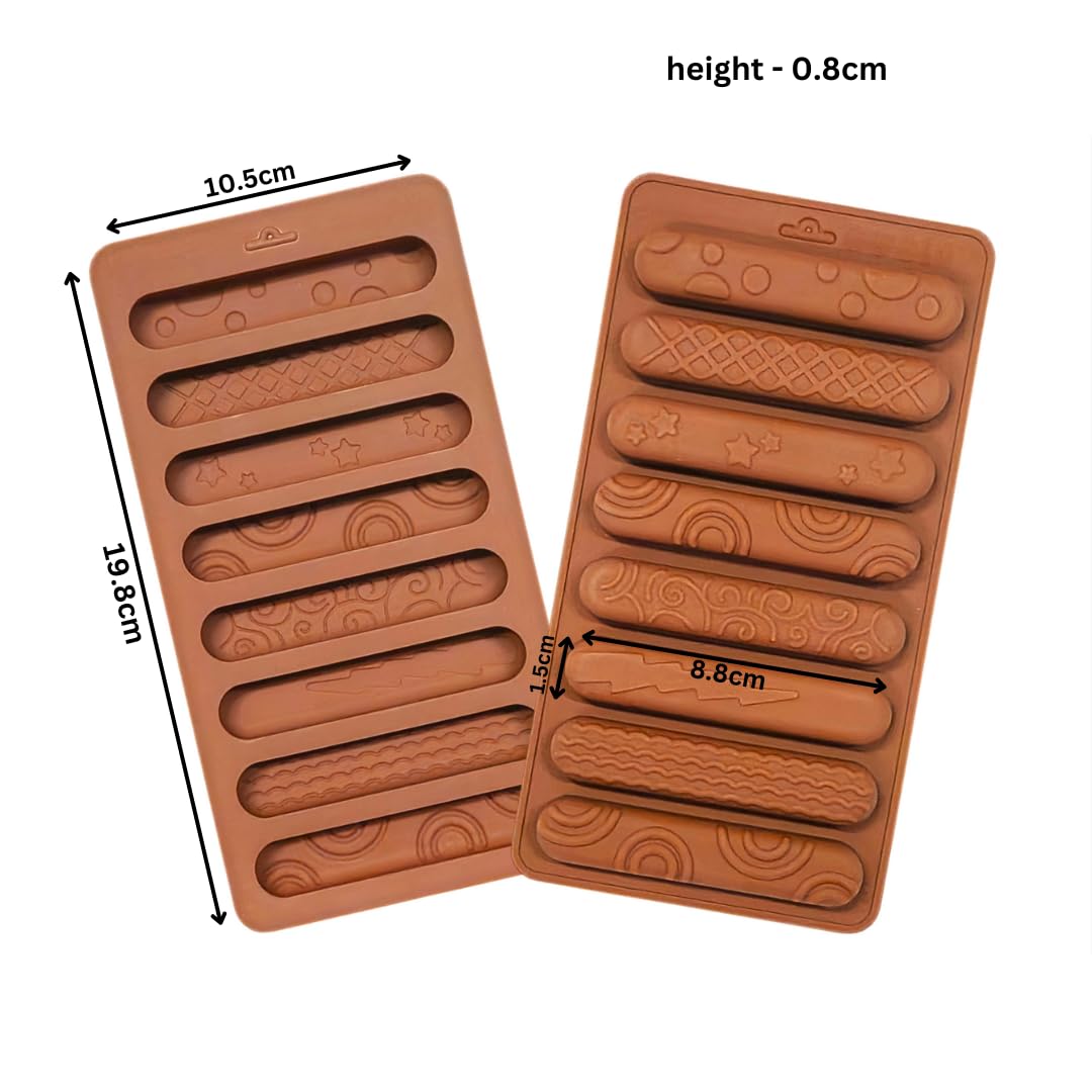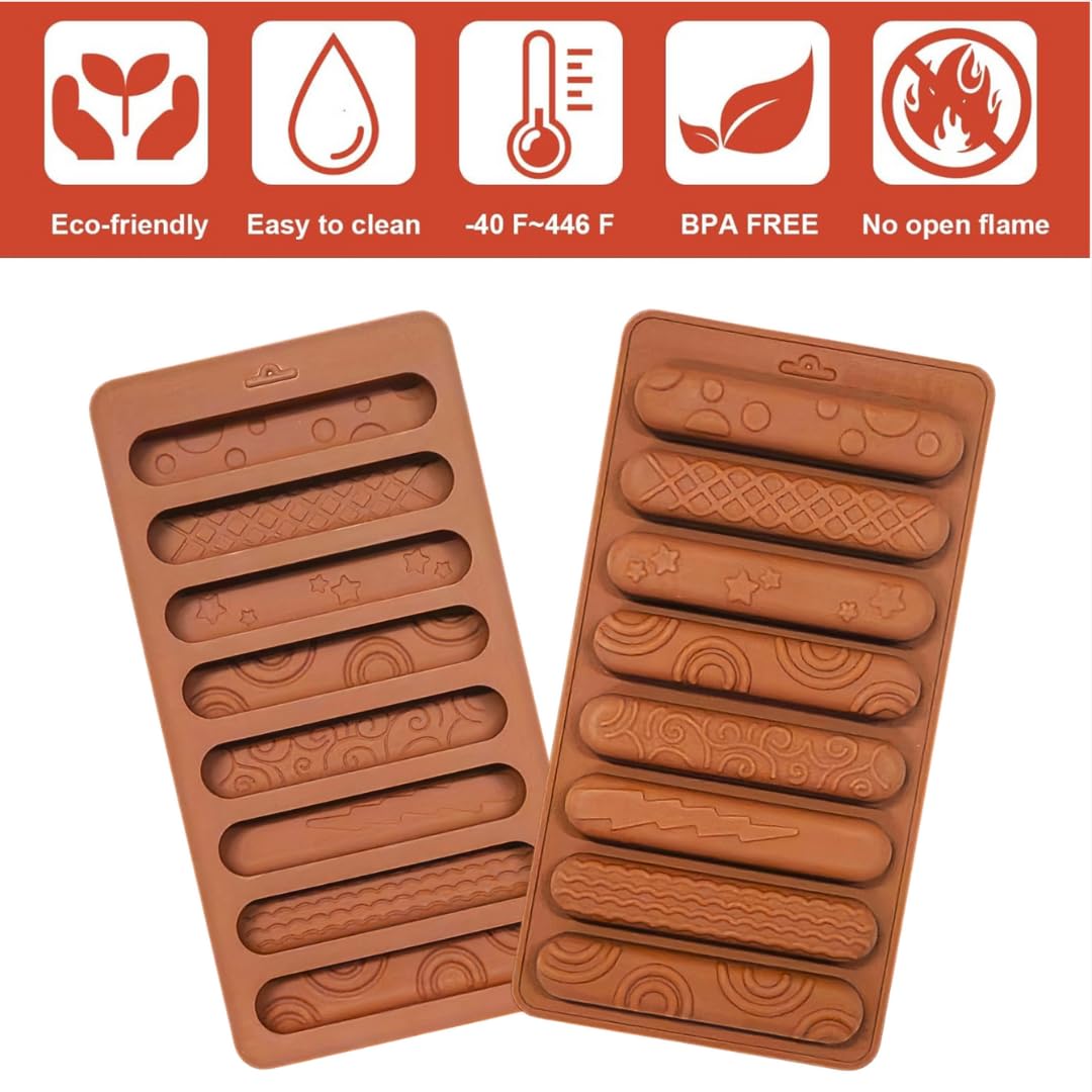 تُظهر الصورة قوالب شوكولاتة، تُستخدم على الأرجح لصنع ألواح شوكولاتة أو قطع شوكولاتة صغيرة بأشكال مميزة.