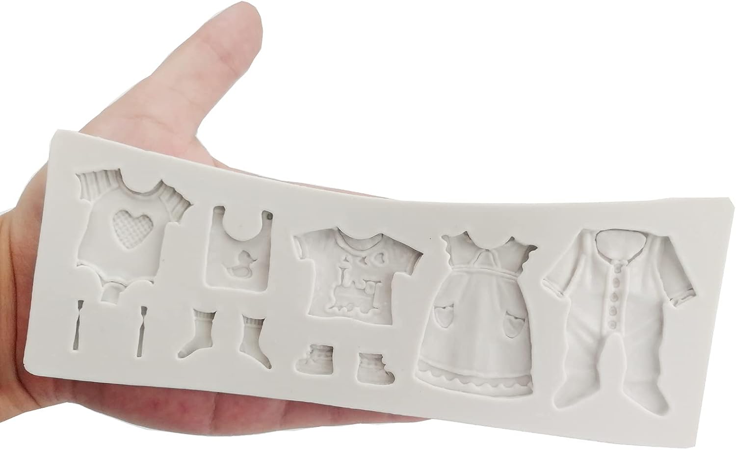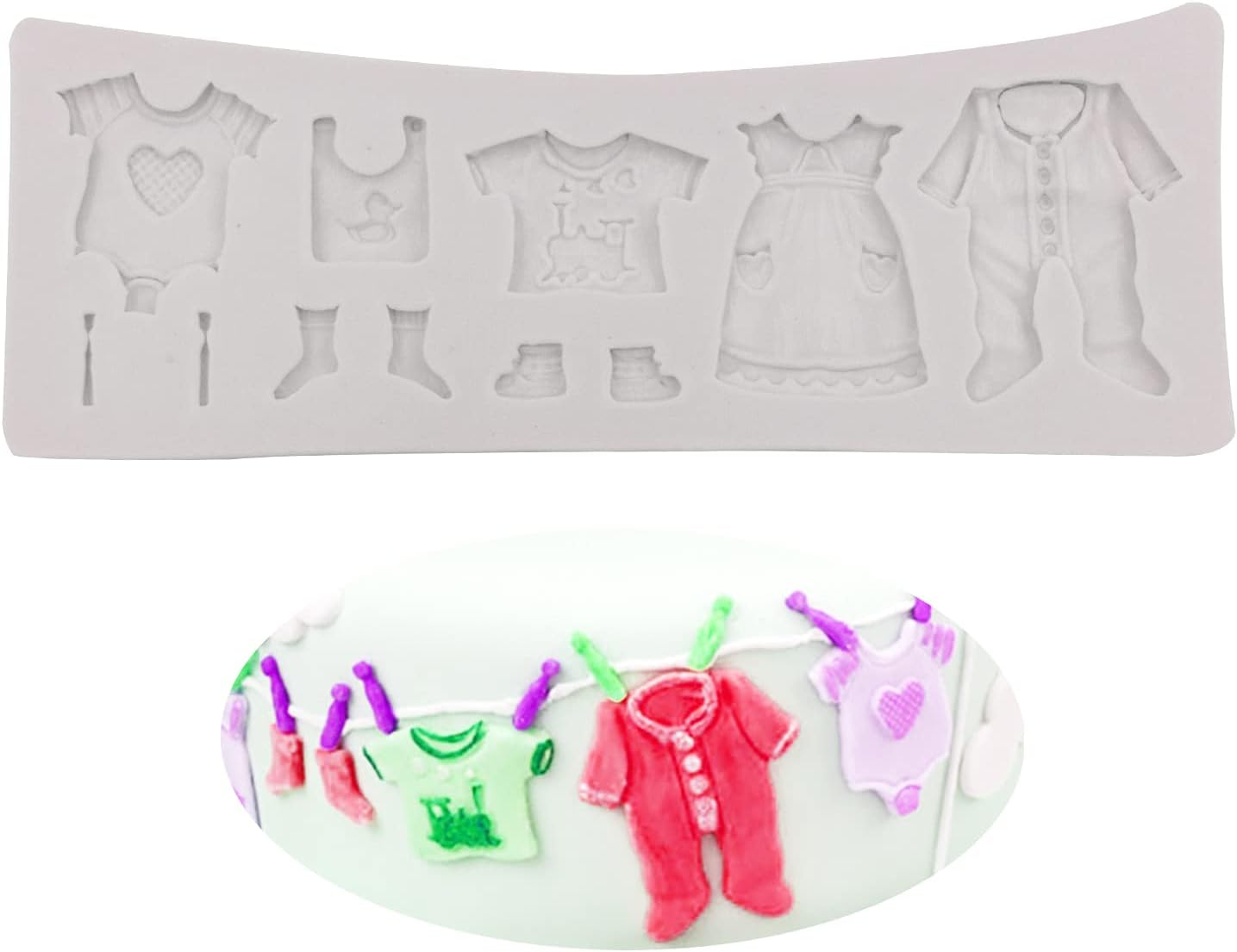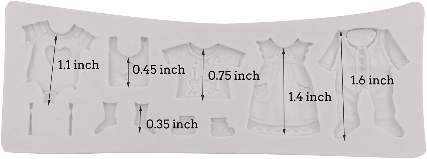 قالب ملابس الأطفال: سوف تحصل على قالب واحد من السيليكون لصنع ملابس الأطفال. يختلف حجم كل قالب، يرجى الرجوع إلى الصورة لمعرفة الحجم المحدد. باستخدام قالب ملابس الأطفال المصنوع من السيليكون هذا، من السهل إنشاء أشكال مفصلة بتصميمات مثيرة، مثالية لتزيين كعكاتك. إنه حقا يوفر الوقت! مما يسمح لك بإضفاء الجودة على عملك.