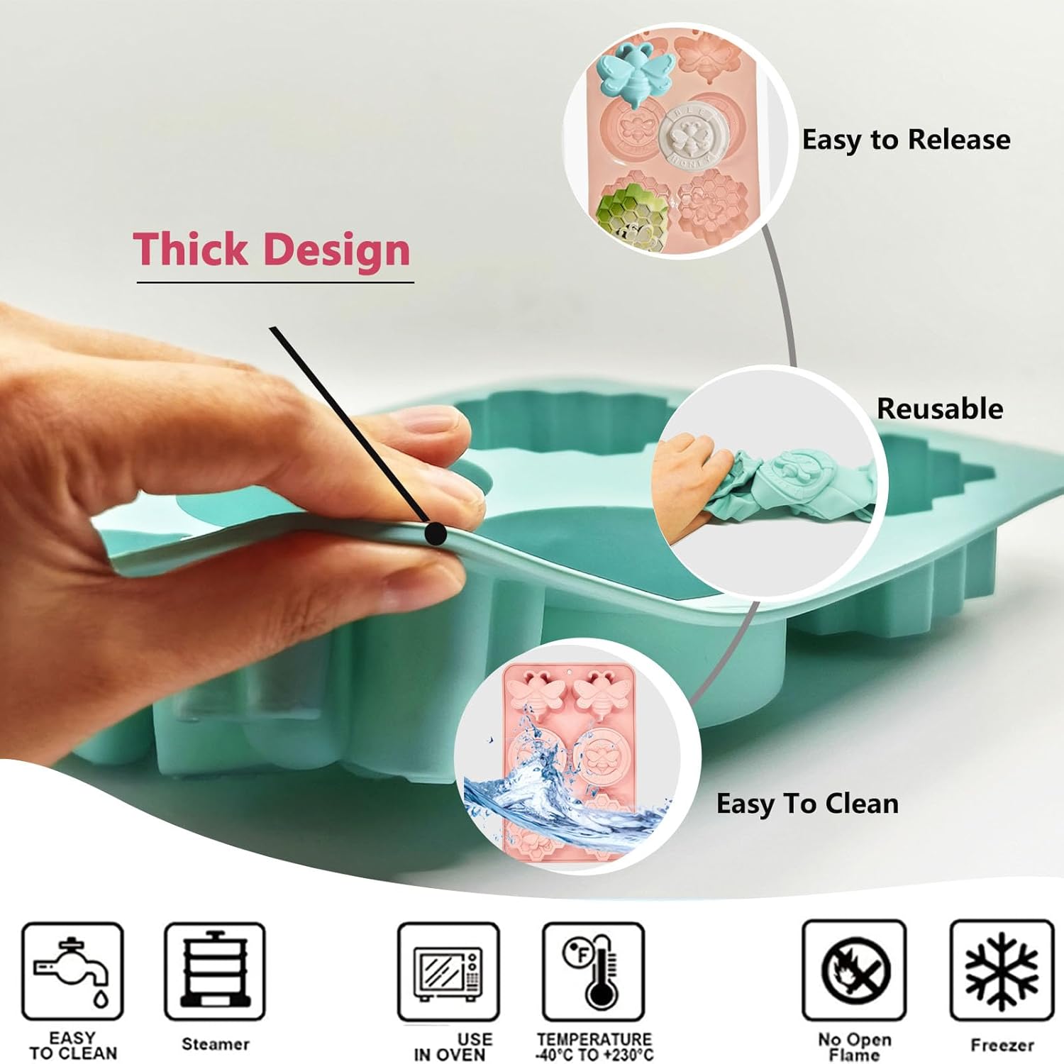 مادة صالحة للطعام: قالب سيليكون النحل مصنوع من سيليكون سميك صالح للطعام، خالٍ من مادة البيسفينول أ، مرن وغير لاصق، وهو آمن للاستخدام في الفرن والميكروويف والفريزر وغسالة الأطباق. درجة حرارة آمنة من -104 إلى +446 درجة فهرنهايت (-40 إلى +230 درجة مئوية).