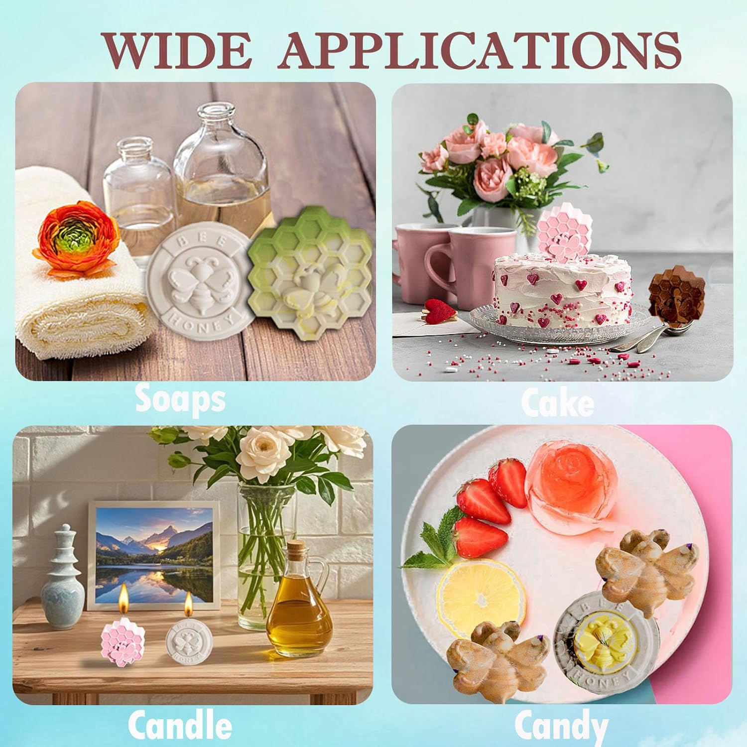 قابل للتطبيق على نطاق واسع: يمكن استخدام قالب صابون النحل ليس فقط لصنع صابون على شكل نحلة، وقضيب لوشن، وعيدان لوشن، وقنابل استحمام، وقنبلة استحمام، وبخار استحمام، وشموع، وحرف يدوية من الراتينج، وما إلى ذلك، ولكن يمكن استخدامه أيضًا للشوكولاتة والكعك والكعك والهلام والبودنج، وما إلى ذلك.